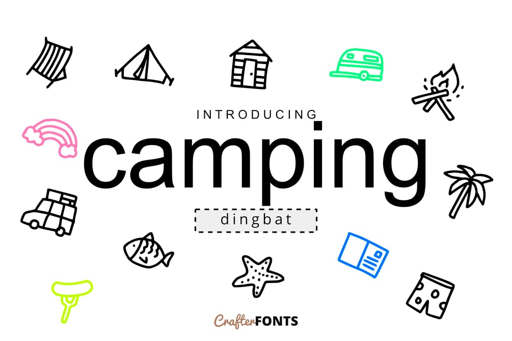 Simple camping doodle dingbat, suitable for many project, logo, ornament etc. Contain 62 symbols as the preview above.